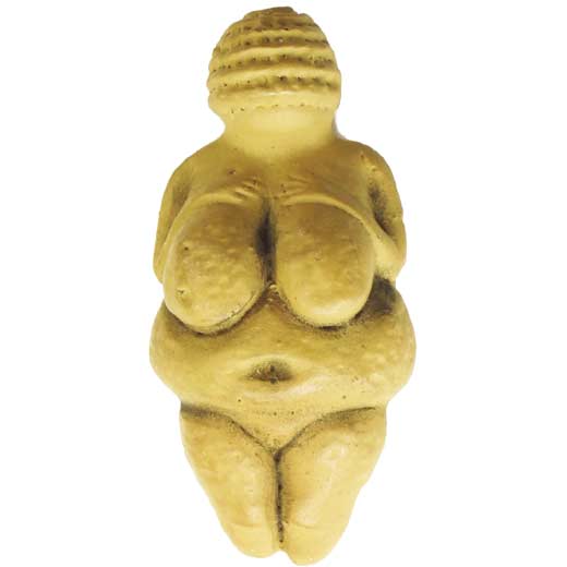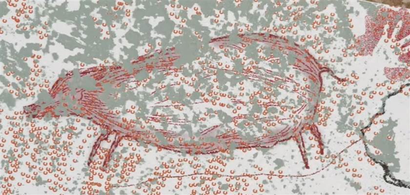 man. We are that species. Homo sapiens differs radically from his predecessors in many ways. A key difference was his greater intellect. About 40,000 years ago, a comparatively recent time on the evolutionary scale, he changed everything because of it. It was then that Homo sapiens began recording what he saw and felt on cave paintings, glyphs on rock wall outcroppings, and statuettes. Recording in its most primitive state is old. Cave men drew pictures of animals on walls and made spatter print images of their hands with spit and charcoal; aborigines scratched glyphs on rock wall outcroppings. Sculpture and painting have been with us since well before ancient Egypt, as evinced by 32,000 year old paintings on the walls of Chauvet Cave in southern France, the Venus of Willendorf statuette (shown at the right) dating from perhaps as far back as 25-30 thousand years, cave wall drawings at Altamira in Spain dating back more than 20-thousand years, and cave wall drawings at Lascaux Cave in southern France dating back to more than 17,000 BCE. A stencil image of a human hand in Spain's El Castillo cave has been dated to 37,00 years and a red disk in the same cave has been dated to 40,800 years. Man not only acquired an aesthetic sensibility some 40,000 years ago; in conjunction with that he gained both the ability to express the aesthetic sensations he experienced and the ability to record them. He expressed them by recording them. Where recording is concerned, it's especially fortunate that man's new, more capacious brain allowed him to both experience and express art, because recording anything would have been meaningless without it; there would have been nothing to record. The estimated ages for some of the ancient recordings cited above are changing: they're getting older. A new technique for dating rock art sites called uranium-series disequilibrium dating, or more simply, uranium-series dating, is pushing back our current understanding of the true age of these artifacts when compared with less accurate estimates derived from traditional carbon dating techniques. Archeologists using uranium-series dating are finding that the earliest cave paintings they are now examining in Western Europe reach as far back as at least 40,800 years. When existing estimates for art in caves like Altamira and Lascaux are revised with the new technique, it's likely that these current estimates of their age will be among those elevated. Ancient art was not only created in Europe by early humans. Aborigine paintings on rock outcroppings in Australia's Arnhem Land have been found that date as far back as 40-thousand years. Another recent finding of a cave wall stencil of a human hand in Sulawesi, Indonesia has been dated to 39,900 years ago. Drawings of animals hunted by humans have been found which date as far back as 35,400 years. Below, a computer-enhanced 35,000-year old Sulawesi cave wall painting of a fruit-eating animal called a pig-deer.